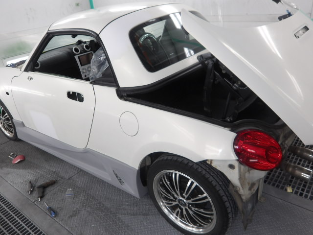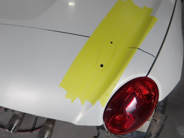 入庫をした車はコペン。もちろんセリカの純正ウィングはコペンには合わないので、ウィングの取り付け位置をマークして穴を開けました。